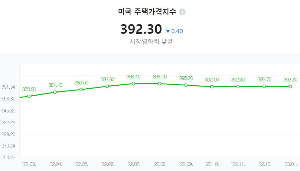 올해 초 CPI 항목별 지출의 가중치를 조정하여 주거비는 기존 32.92%에서 34.41%으로 비중 상향되었기에 지속적인 주거비용 상승의 영향이 더 크게 CPI에 영향을 준 것으로 예상된다. 다만 아래 그래프를 보면 알 수 있는 것처럼 지속적으로 상승하던 미국 주택 가격이 작년 7월을 기점으로 하락 국면으로 전환하였고 이에 따라 임대료도 후행적으로 하락할 수 있으니 주거비 부분은 시간이 가면서 하락할 것으로 보인다.