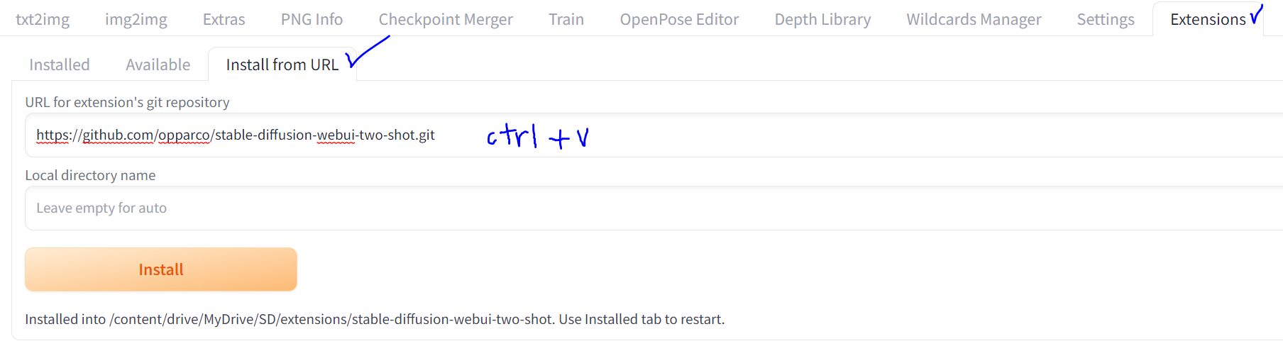 그러고 나서 스테이블 디퓨전의 Extensions-Install from URL의 URL for extension's git repository 항목에 아까 복사한 url을 붙여 넣어 줍니다. 그리고 Install 버튼을 누르면 됩니다.