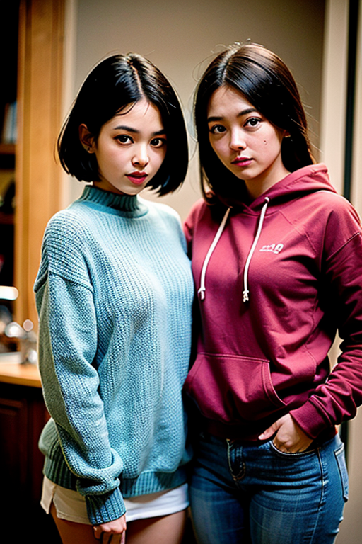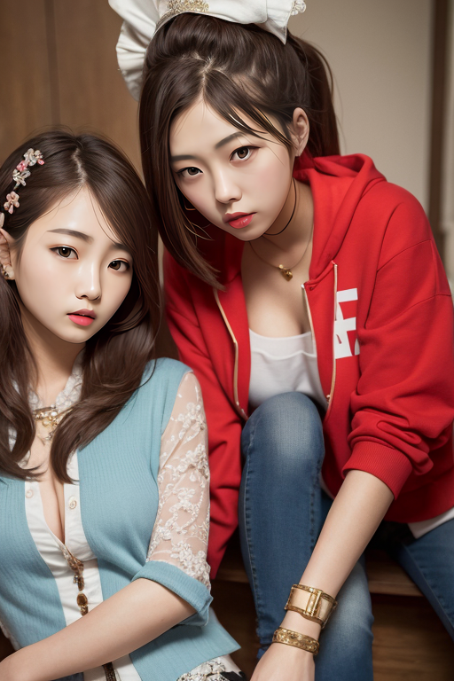 AND (masterpiece), intricate details, 2girls, pale skin, beautiful korean girls, red hoodies, jeans, ponytail,