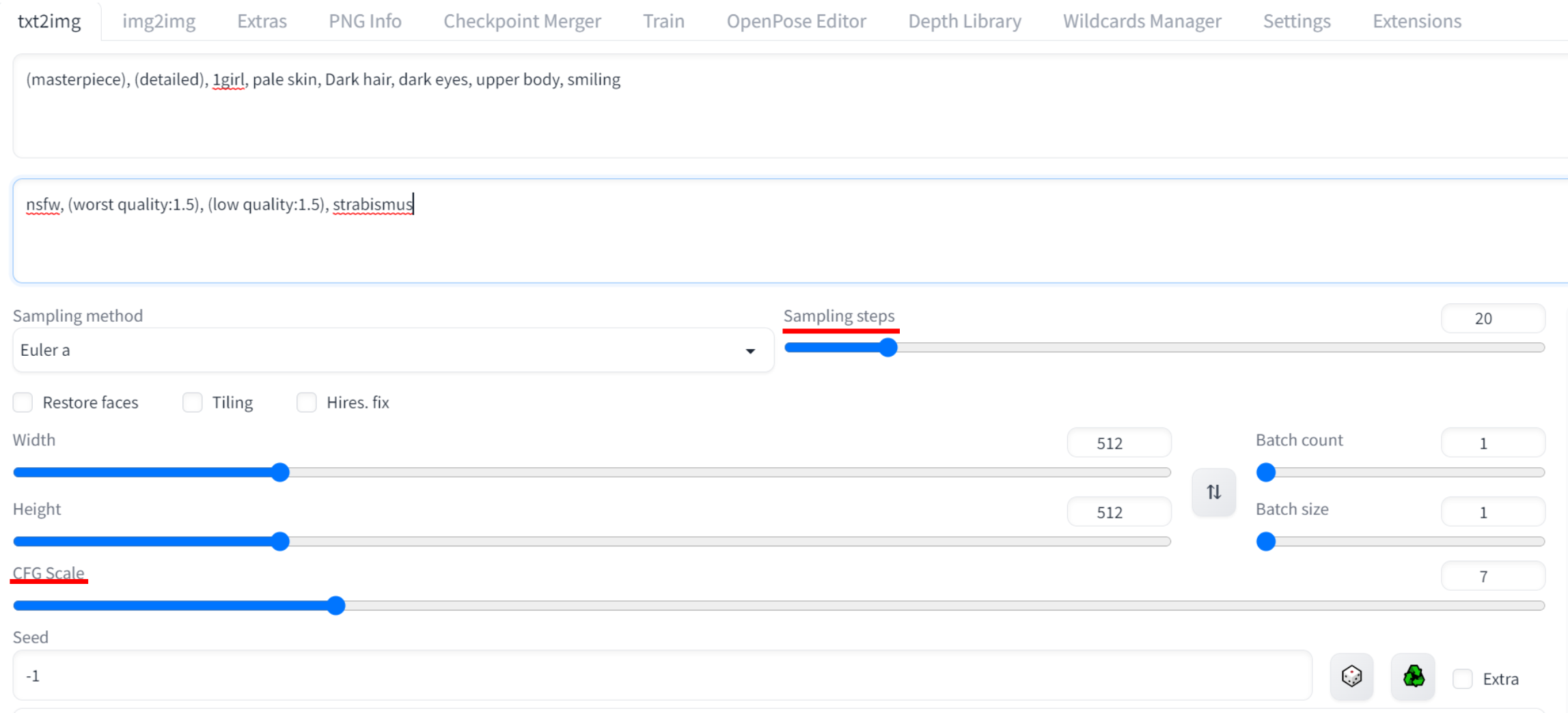 Stable Diffusion의 원리를 간단히 말하면 무수한 원본 이미지를 점 단위로 분해하는 노이즈 과정을 통해 학습하고 이를 다시 디노이즈 과정을 통해 원본 이미지와 유사하게 복원시키는 방식입니다. 이때 Sampling steps은 이런 복원에 사용되는 디노이즈 단계를 몇단계로 하는지를 나타내는 것이고, CFG Scale은 이미지를 생성할 때 사용자가 제시한 프롬프트를 얼마나 반영할지를 나타내는 수치입니다. 수치가 클수록 더 많은 정보를 담게 되고 이는 복원을 위해서 더 많은 단계를 필요로 하게 됩니다. 쉽게 말하자면 CFG가 클수록 더 많은 정보가 그림에 입력되고 이를 정확하게 복원하기 위해서는 더 많은 Sampling Step 수가 필요한 겁니다.