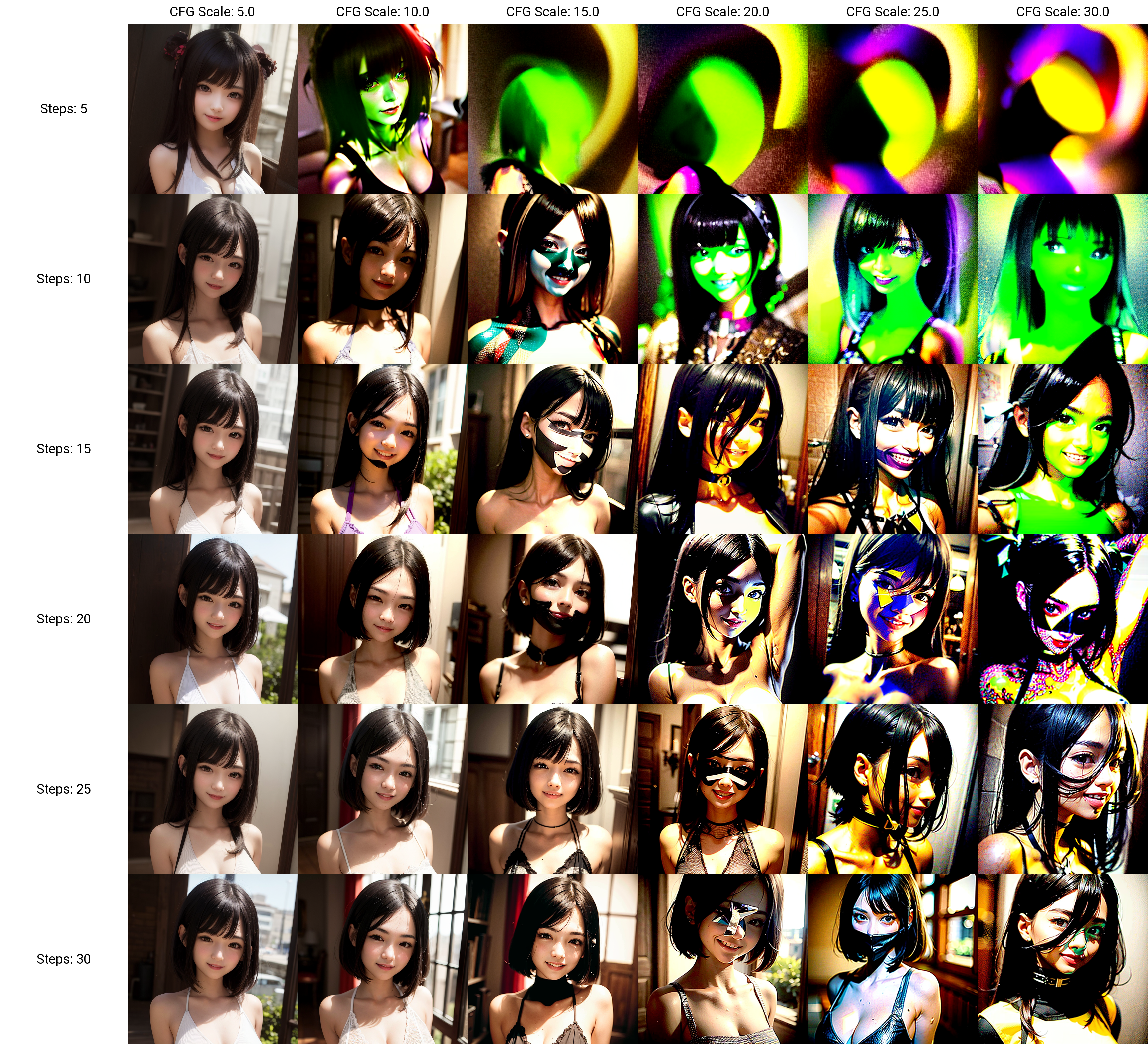 아래 이미지를 참고해 보겠습니다. CFG를 높게 가져갈 수록 Step 수를 그에 맞춰 높여주지 않을 경우 이미지가 뭉개지거나 원하지 않는 형상들이 섞여 들어가는 것을 볼 수 있습니다. 최적의 값은 개인의 사용 조건에 따라 다를 수 있으니 여러 실험을 통해 적절한 CFG와 Sampling steps 조합을 찾는 게 필요합니다. 저는 보통 CFG 5~10, Sampling Steps 15~25 사이에서 조절해 가며 사용하는 편입니다.